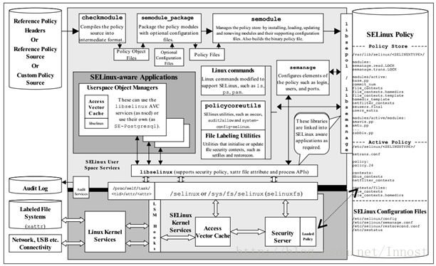- 最顶上,Reference Policy, checkmodule, semodule_package,semodule等讲得都是Policy编译相关的工具和参考文件。这些东西编译完后,会生成最右边那个圆柱体SELinux Policy
