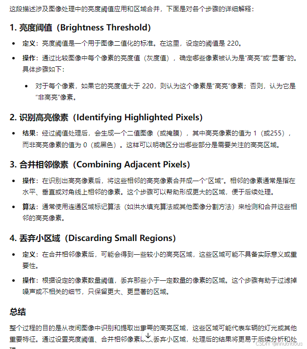 Then, we apply a brightness threshold of 220 to identify the highlighted pixels in the night image. After identifying the highlighted pixels, we combine the adjacent pixels into regions while discarding regions with fewer pixels.解释一下