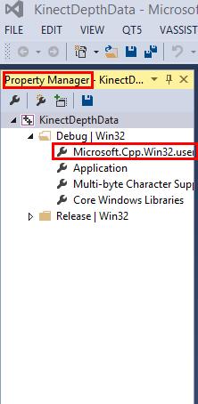 打开VS2013,新建project,命名为"KinectDepthData"。打开"VIEW"中的"Property Manager",打开"Debug | Win32"下的"Microsoft.Cpp.Win32.user":