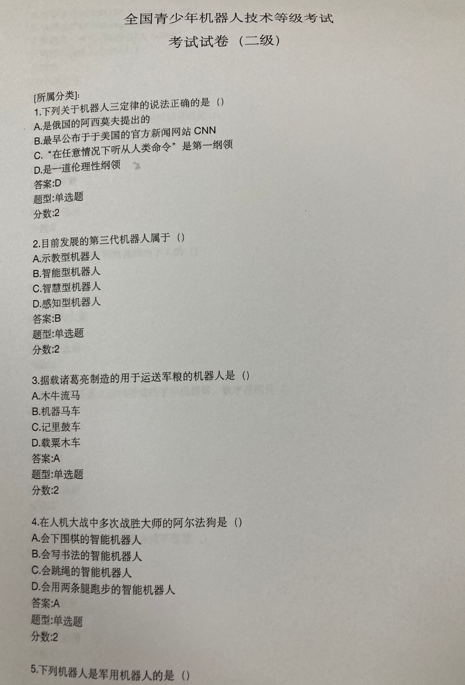 辅导机构的老师,后来就给我拿来了一个《全国青少年机器人技术等级考试(二级)》的卷子。我大概浏览了一下。一些是关于记忆理解的,也有一些是偏物理方面的知识,比如杠杆,滑轮,力的分解,速度等。