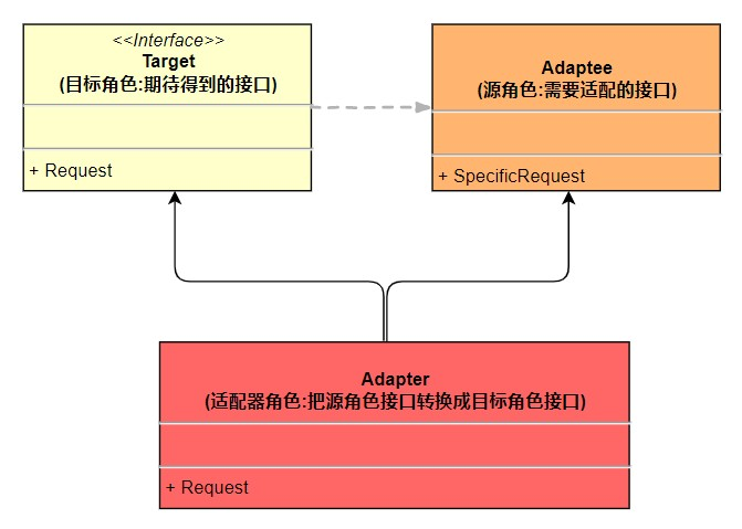 - 解决⽅案:为使 Target 能够使⽤ Adaptee 类⾥的 SpecificRequest ⽅法 **,故提供⼀个中间环节 Adapter 类,把 Adaptee 的 API 与 Target 的 API 衔接起来 **(适配)。