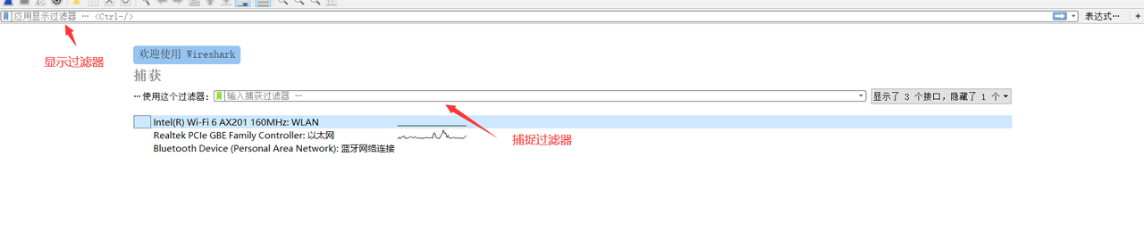 - 显示过滤器 : 会捕捉所有的数据包, 只显示符合过滤规则的数据包