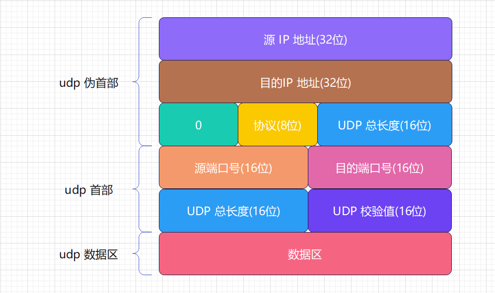 - udp 协议由 伪⾸部、⾸部、数据区构成