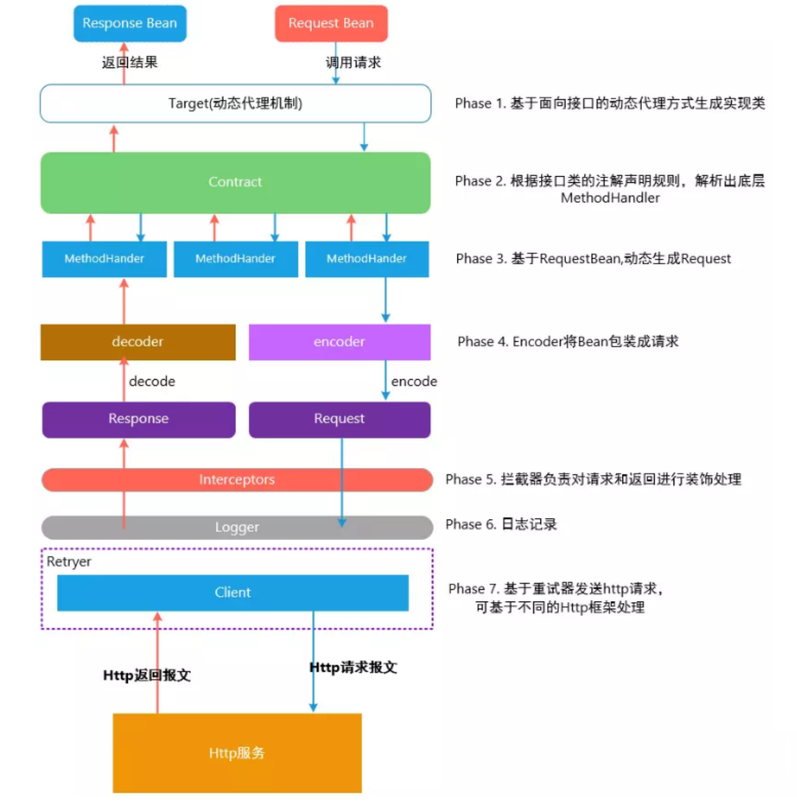 Target(动态代理层),即为我们通过FeignClient实现RPC定义的接口层,此次技术使用了Java的动态代理技术和SpringBoot里的BeanProcessor的Bean生命周期管理的技术;