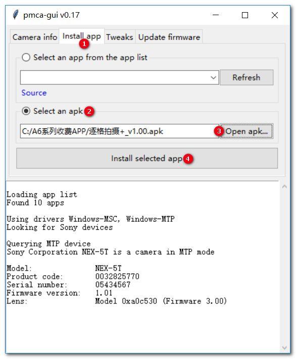 3. 在电脑上用鼠标双击运行软件 pmca-gui,选择标签页“Install app”(下图①处),先点击“Select an apk”(下图②处),后点击“Open apk...”按钮(下图③处),找到要安装的程序,最后点击“Install selected app”按钮(下图④处)开始安装: