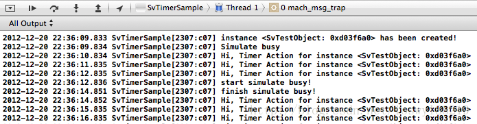 例子中首先开启了一个timer,这个timer每隔1秒调用一次target的timerAction方法,紧接着我们在3秒后调用了一个模拟线程繁忙的方法(其实就是一个大的循环)。运行程序后输出结果如下: