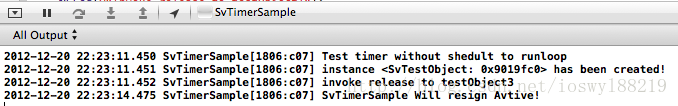观察运行结果,我们发现这个timer知道执行退出也没有触发我们指定的方法,如果我们把上面测试程序中“//[[NSRunLoop currentRunLoop] runUntilDate:[NSDate dateWithTimeIntervalSinceNow:3]];”这一行的注释去掉,则timer将会正确的掉用我们指定的方法。