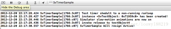 这个小例子中我们新建了一个timer,为它指定了有效的target和selector,并指出了1秒后触发该消息,运行结果如下: