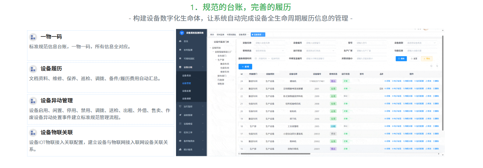 标准规范信息台账,一物一码,设备异动记录,构建设备数字化生命体,系统自动完成设备全生命周期履历信息管理。