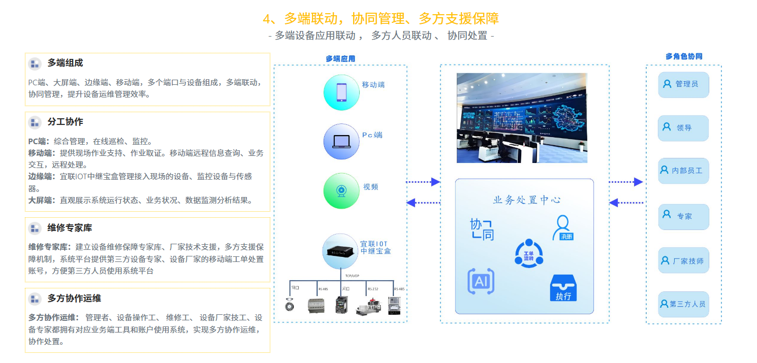 管理端、大屏、移动端、设备边缘端多端应用, 整合管理者、操作工、 维修工、 设备厂家技工、设备专家多方人员用户,实现多方协作运维、协同处置,多方支援保障。
