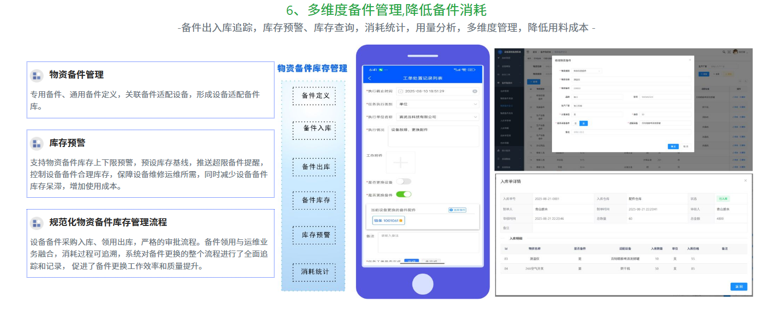 备件出入库追踪,库存预警、库存查询,消耗统计,用量分析,多维度管理,降低用料成本