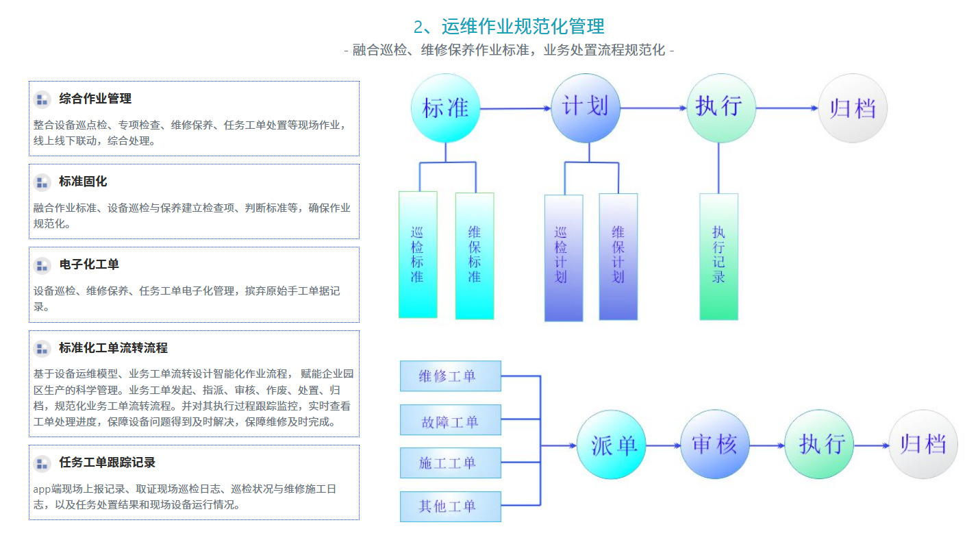 融合巡检、维修保养作业标准,任务工单电子化管理,业务处置流程规范化 。