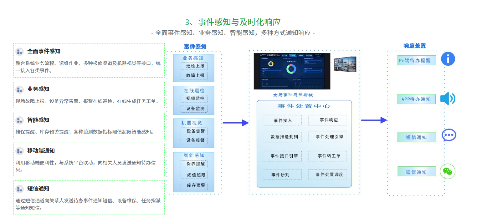 全面事件感知、业务感知、智能感知,app、微信、短信多种方式通知响应,提升事件处置效率。
