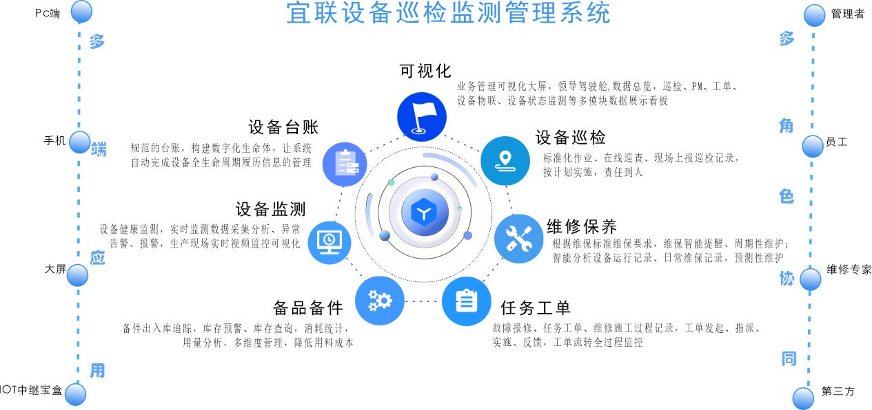 宜联设备巡检监测系统是武汉宜联科技推出的设备全生命周期管理系统,主要应用于工业设备监测管理。旨在提高设备巡检效率和管理水平,实现设备的实时监控与故障预警,降低设备故障及停机时间,提升设备使用寿命。其有八大主要功能: