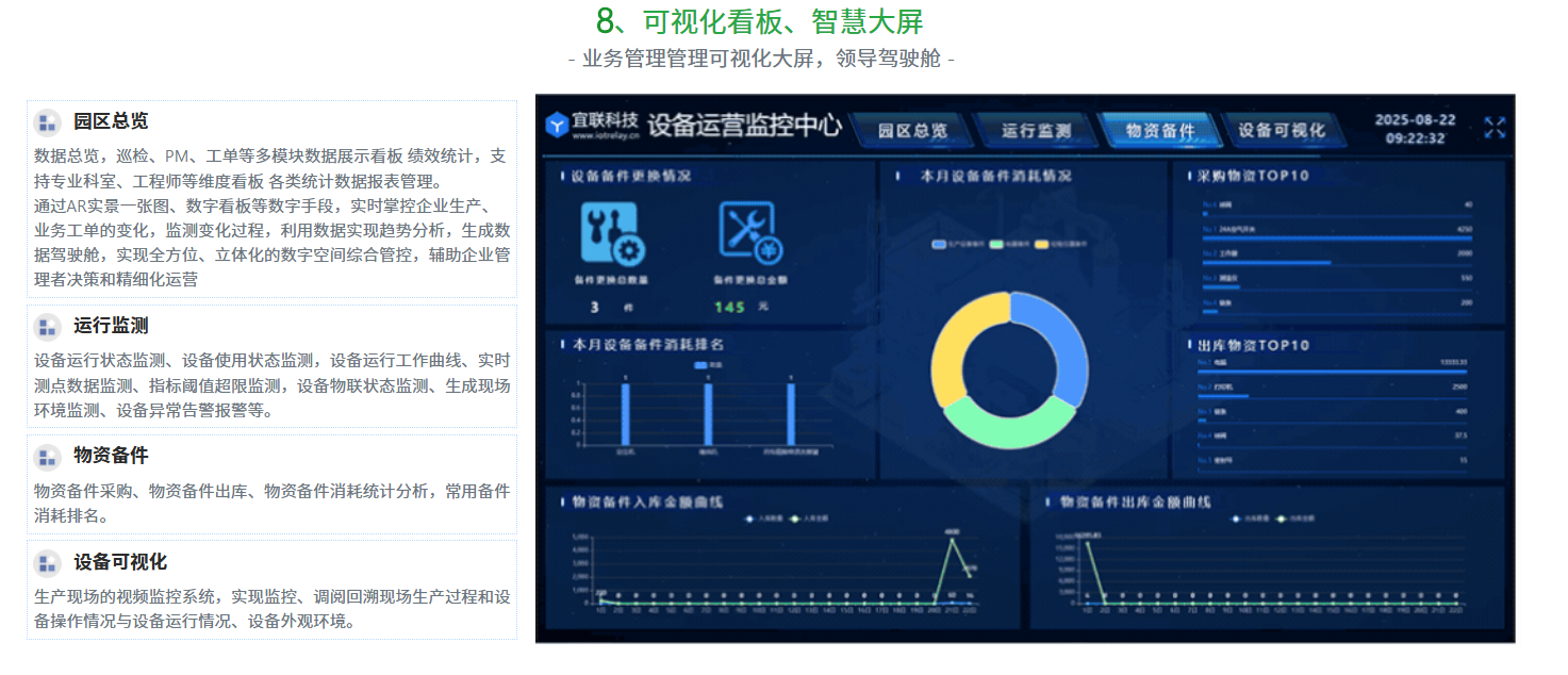 宜联设备管理系统部署成本较低,覆盖工厂、石油化工、生物医药、矿山设备、食品设备等行业,适用于生产设备、园区设施、能源设施等设备管理。