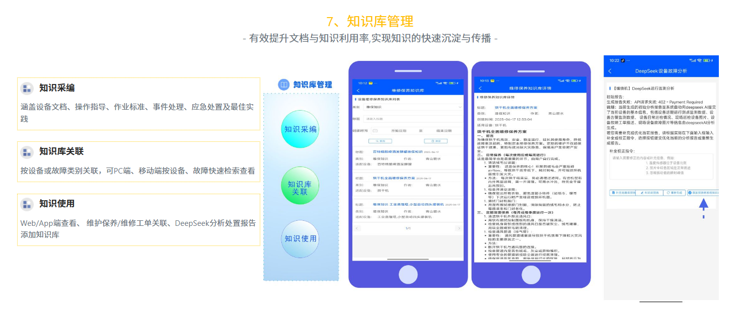 集成设备维修保养知识库,关联设备日常运行、保养维修记录,结合AI智能分析,精准定位设备故障,生成分析报告辅助决策,提升设备检修效率与设备健康水平。