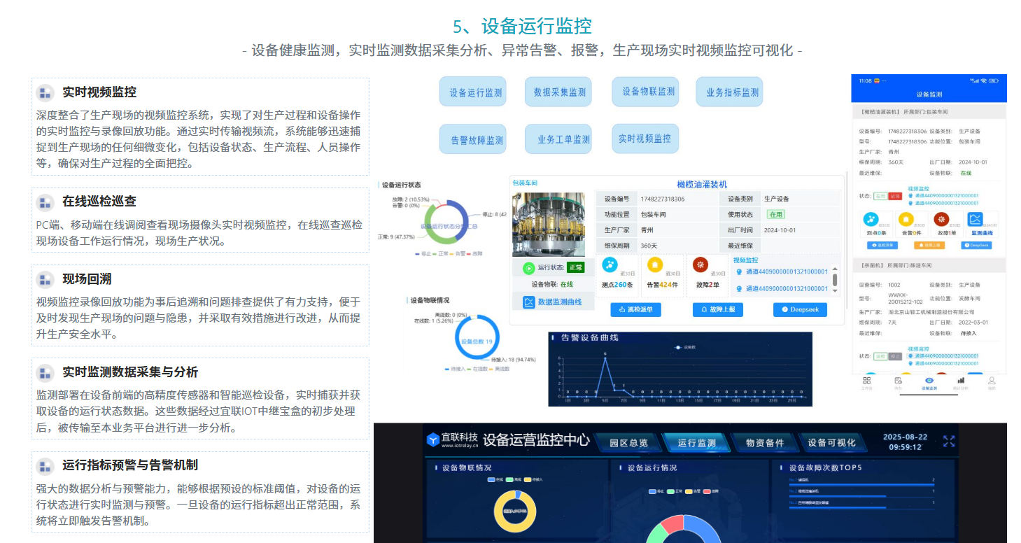 设备运行状态、健康指标数据实时在线监测,异常告警,数据采集实时分析、预测性维护,生产现场实时视频监控 可视化管理。移动端可以远程调阅、管控。