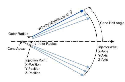 ,锥形半角定义了锥形注入的核心边界。颗粒会均匀地分布在这个锥形角所定义的圆锥体内。色散角定义了在锥形半角的边界之外,颗粒可能出现的额外随机扩散范围。它引入了随机性。总扩散角 = 锥形半角 + 色散角