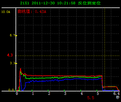 2.**站12#道岔定→反落锁后小台阶电流高。经检查发现第自动开闭器43、44接点接触不良,调整接点后,曲线恢复正常。另外小尾巴曲线幅值正常为0.5A左右,若有一个二极管击穿电压升高为1A;幅值降为一半或更低则为整流匣特性不良。