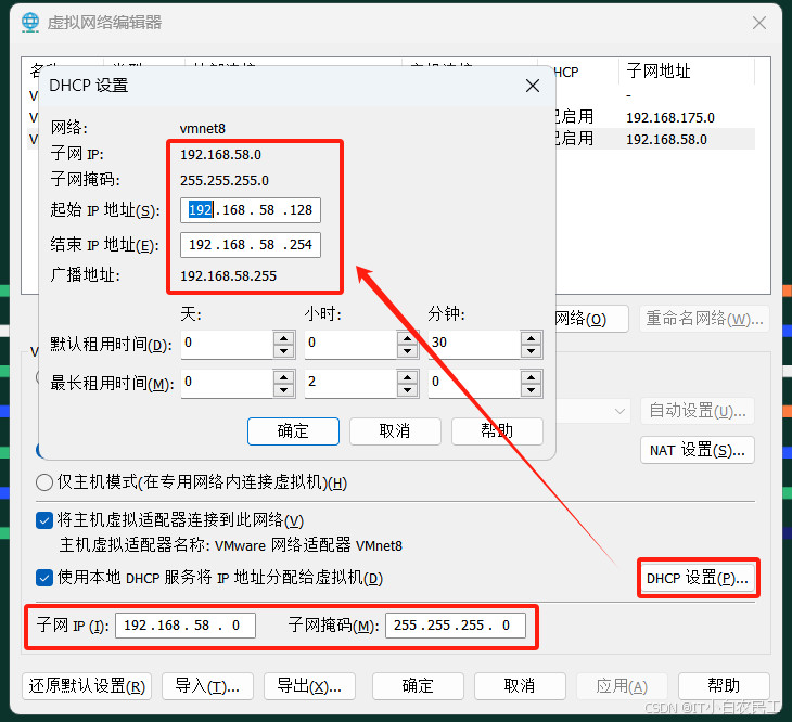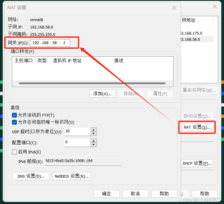 然后打开NAT设置,设置对应的网关IP,这个网关IP就是【VMware Network Adapter VMnet8】的网关
