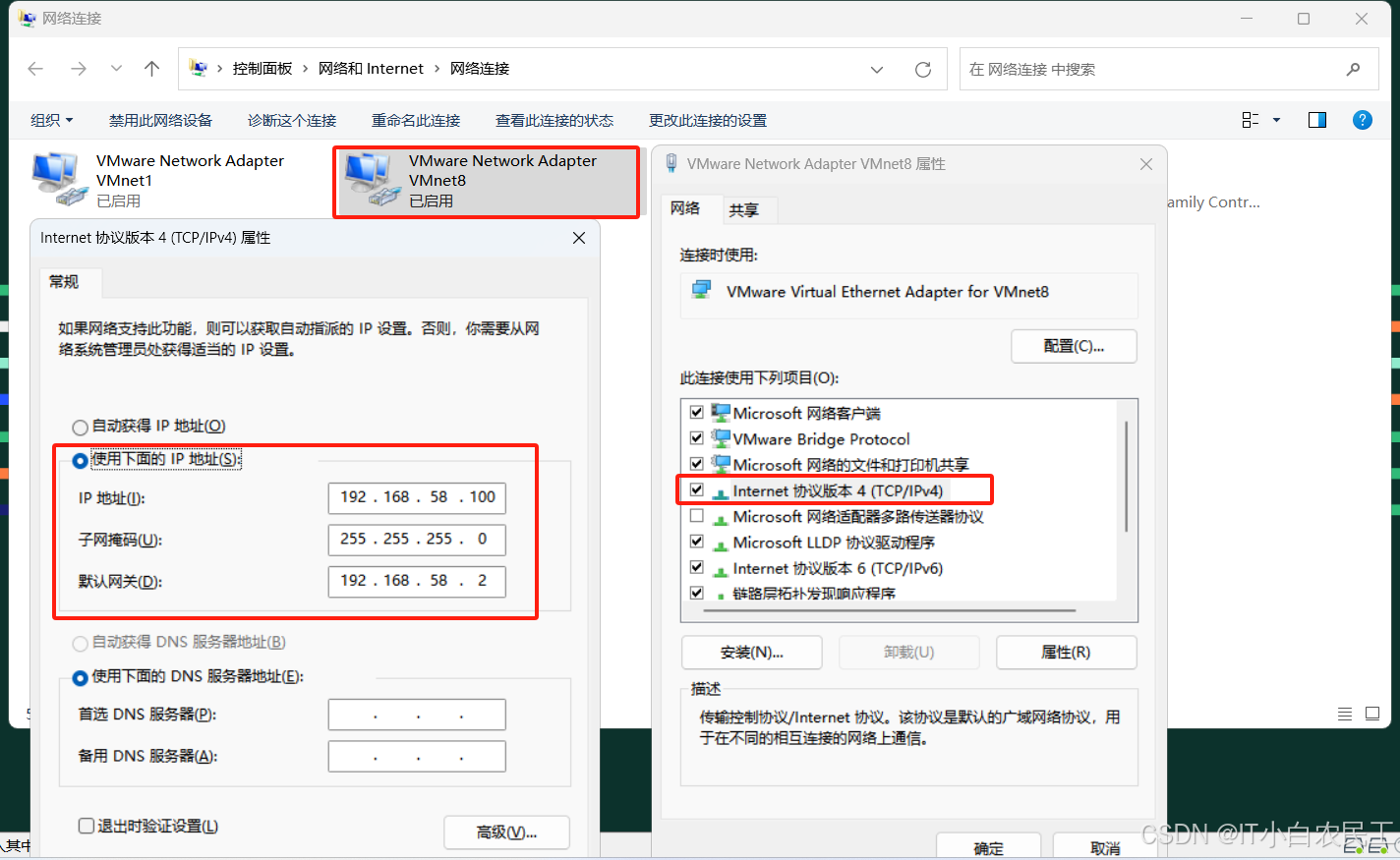 选择自己对应NAT模式网卡,我的是【VMware Network Adapter VMnet8】,右键【属性】-【Internet 协议版本4(TCP/IPv4)】