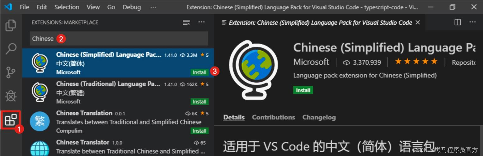 2. 安装中文汉化插件:Chinese (Simplified) Language Pack for Visual Studio Code