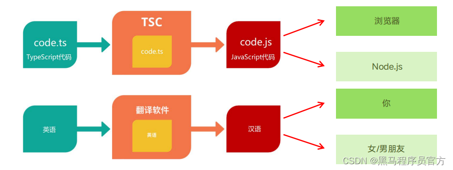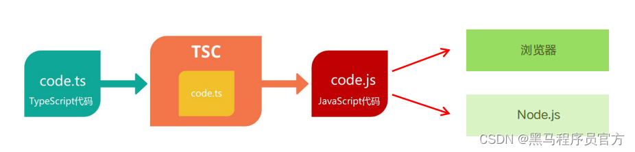 - 需要先将 TS 代码转化为 JS,然后就可以在 Node.js/浏览器中运行了。