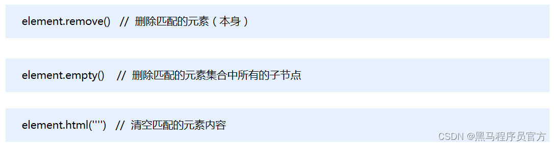 empt() 和 html('''') 作用等价,都可以删除元素里面的内容,只不过 html 还可以设置内容。