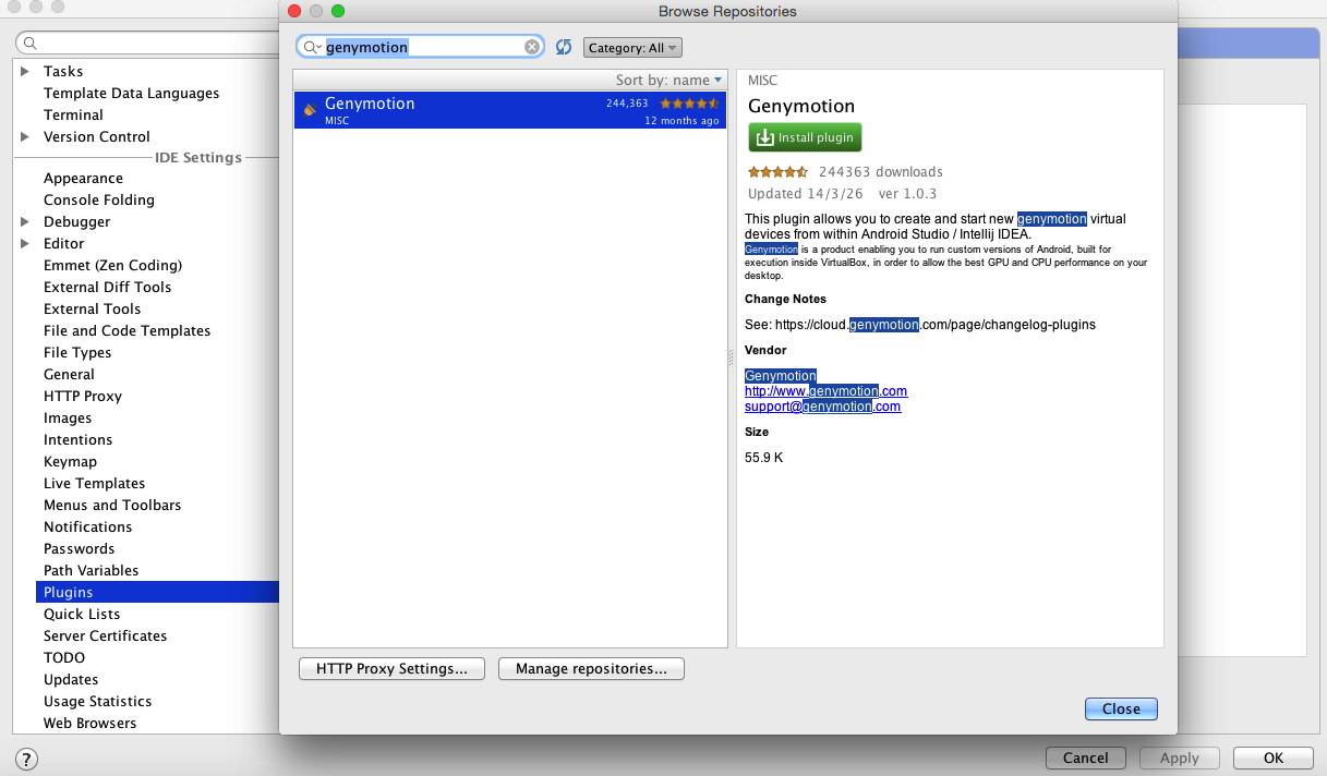 重启之后在工具栏就有了对应Genymotion的图标,关联Genymotion的安装目录就可以使用了。