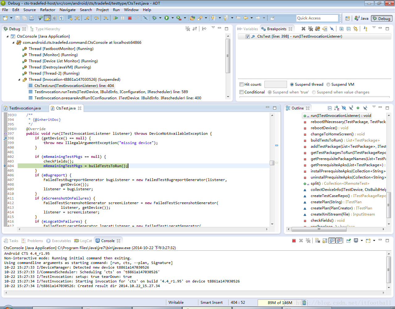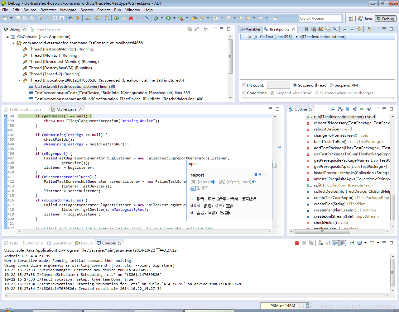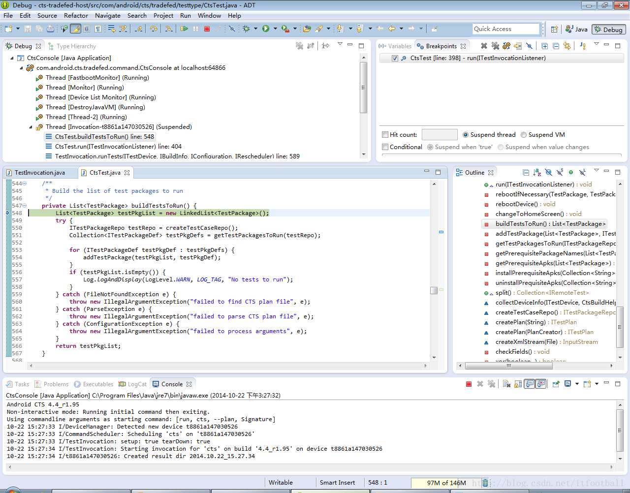因为测试任务是个很复杂的过程,所以要单独拿出来讲,里面还涉及了result_reporter的内容。所以这是一个大块。首先把断点打在CtsTest的run方法中,删除其他断点,重新启动debug模式: