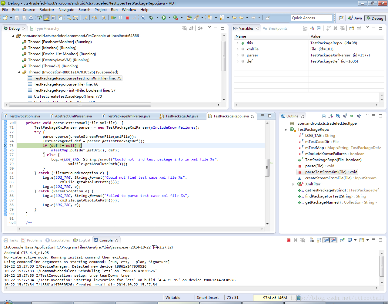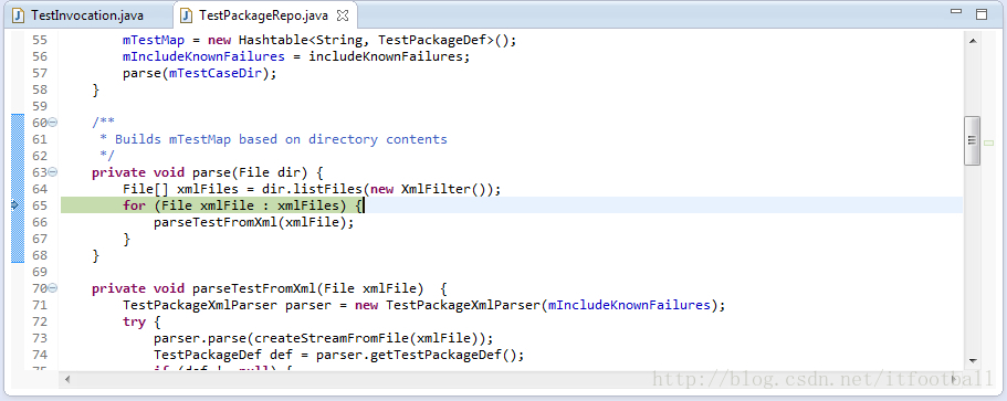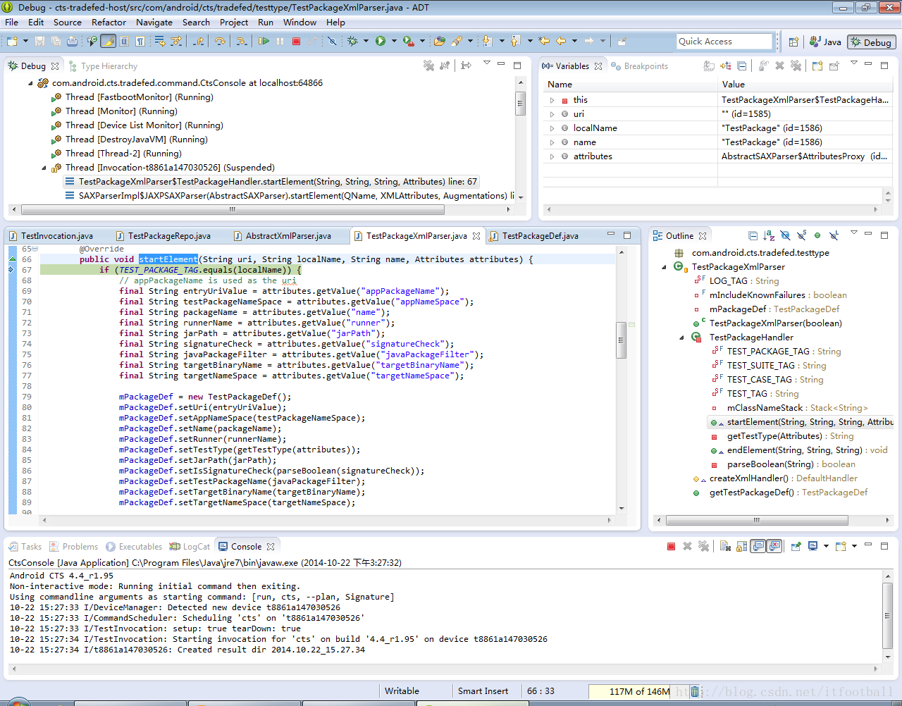 先创建一个TestPackageXmlParser对象,该对象继承于AbstractXmlParser,通过SAX的方式解析xml文件。有关SAX如何解析xml文件的内容我就不多阐述了。parser.parse(createStreamFromFile(xmlFile));按F5,调用的是TestPackageHandler类中的startElement方法。