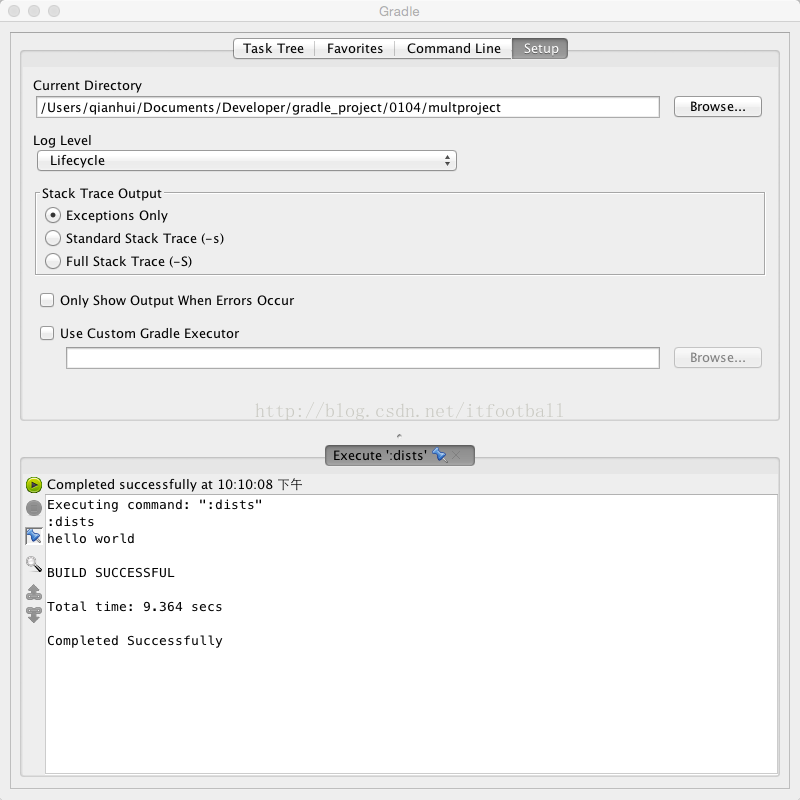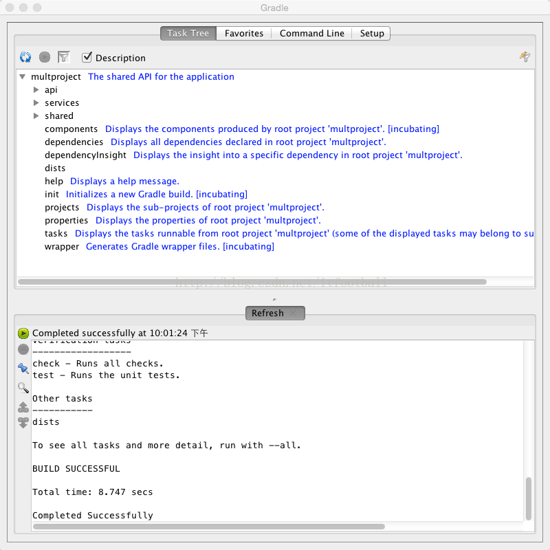 任务树形列表。可以看到在启动的目录下的项目会被例举出来,项目下的一些任务也会例举出来。你可以点击某一个任务,然后点执行按钮,该任务就会被执行。