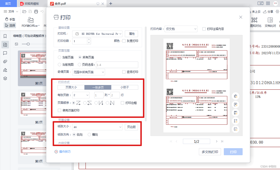 按照以上步骤就可以完成批量的发票打印了,实现一张A4纸张上面打印好2张pdf的发票了。