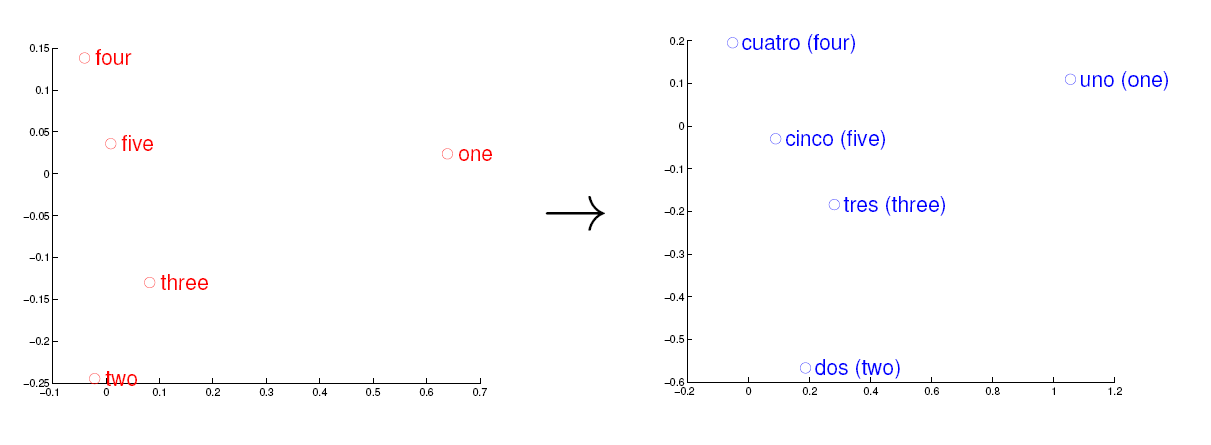 考虑英语和西班牙语两种语言,通过训练分别得到它们对应的词向量空间 E 和 S。从英语中取出五个词 one,two,three,four,five,设其在 E 中对应的词向量分别为 v1,v2,v3,v4,v5,为方便作图,利用主成分分析(PCA)降维,得到相应的二维向量 u1,u2,u3,u4,u5,在二维平面上将这五个点描出来,如下图左图所示。类似地,在西班牙语中取出(与 one,two,three,four,five 对应的) uno,dos,tres,cuatro,cinco,设其在 S 中对应的词向量分别为 s1,s2,s3,s4,s5,用 PCA 降维后的二维向量分别为 t1,t2,t3,t4,t5,将它们在二维平面上描出来(可能还需作适当的旋转),如下图右图所示: