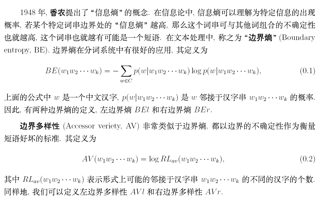 在 NLP 任务中,特征是一个很重要的概念。在实际应用中,除一些常规的特征外,我们还经常会引入一些有用的额外特征,例如,进行命名实体识别(named entity recognition)任务时,可以提供一个这样的特征:指明一个字是否为常见中国姓氏。另外,也可以引入一些基于统计的量,例如边界熵(boundary entropy),边界多样性(accessor variety)等就常用于非监督型的中文分词模型,下面对这两个特征进行简要介绍。