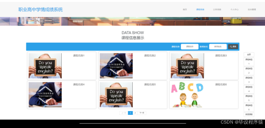 【毕业论文】网上开课与选课系统JAVA-SSM 网上开课与选课系统采用java技术,基于mysql开发,实现了个人中心,公告信息管理,学院管理,专业管理,班级管理,学生管理,教师管理,教师管理,课程信息管理,学生选课管理,课程成绩管理等内容进行管理,本系统具有良好的兼容性和适应性,为学生和教师提供更多的课程信息,也提供了良好的平台,从而提高系统的核心竞争力。