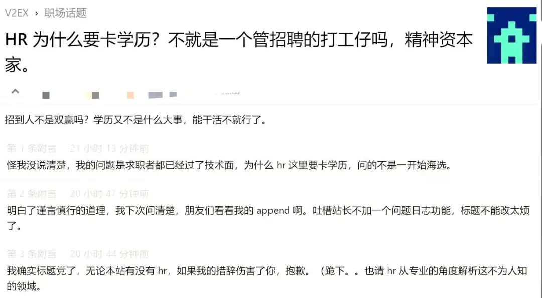 于是乎今天在V2EX看到这篇帖子“HR 为什么要卡学历?不就是一个管招聘的打工仔吗,精神资本家”。