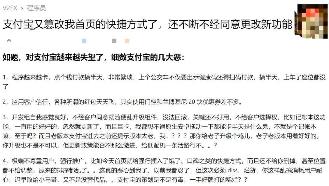 支付宝随意篡改首页快捷方式,不经同意更改新功能,程序卡,滥用客户信任,不尊重用户。这一件件,足以把一个用户的好感消磨完了。
