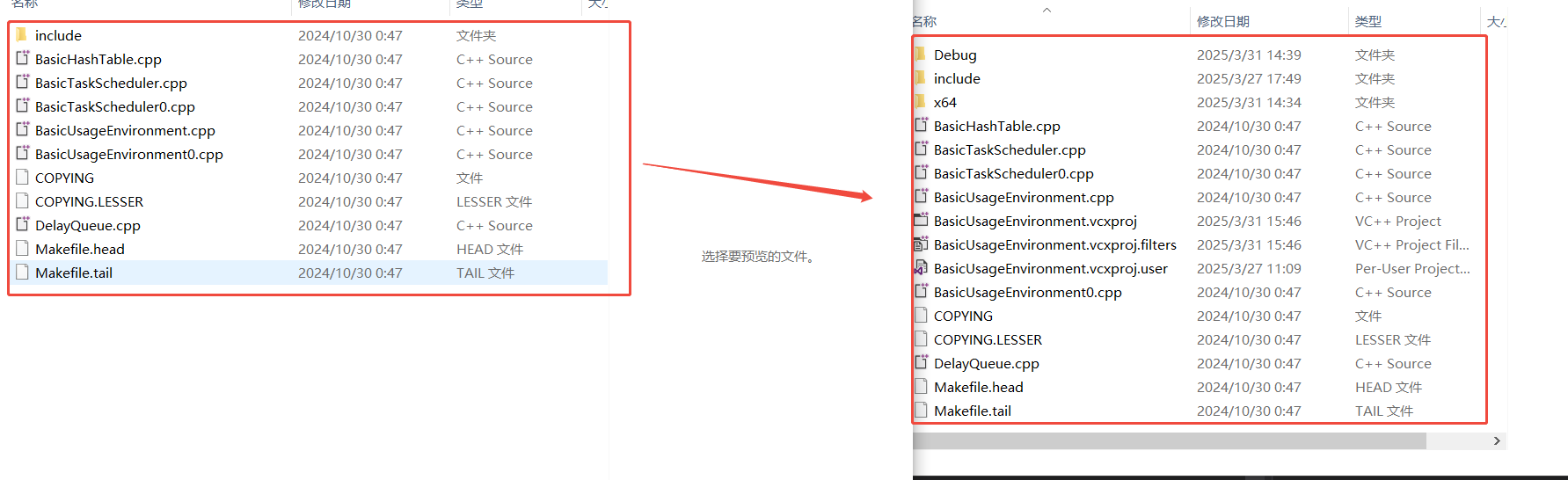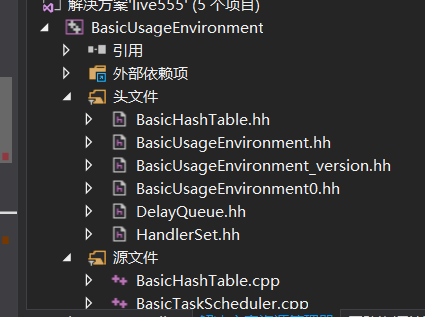将解压好的文件,对应的文件夹的内容,分别移动到项目的对应的文件夹下面,如下面两幅图所示,移动BasicUsageEnvironment的所有文件到项目中。 只需要移动 .cpp .c .hh .h(头文件在include的直接移动include文件夹)文件。