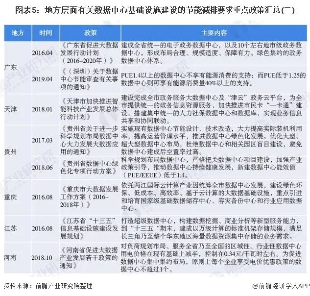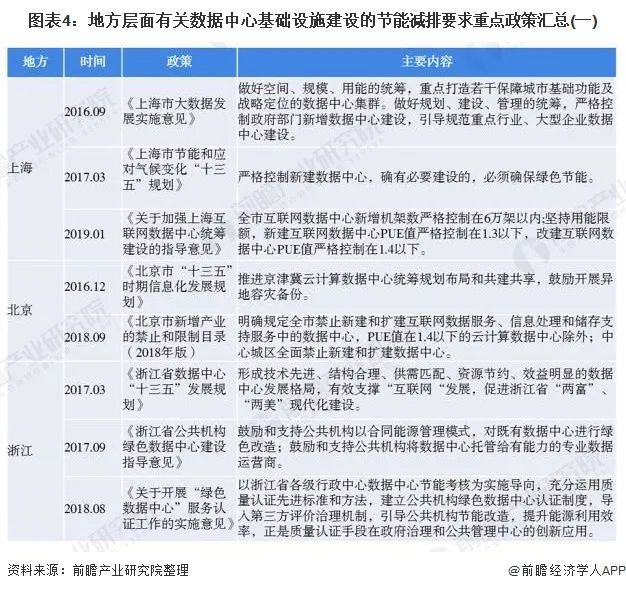 北京则在《北京市新增产业的禁止和限制目录(2018年版)中明确提出禁止新建和扩建互联网数据服务、信息处理和储存支持服务中的数据中心,PUE值在1.4以下的云计算数据中心除外;中心城区全面禁止新建和扩建数据中心。