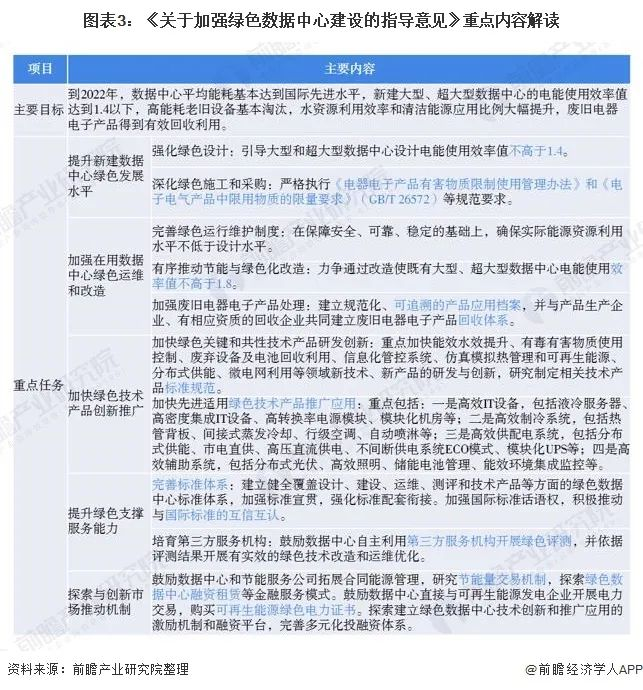 2019年2月,工业和信息化部、国家机关事务管理局和国家能源局发布《关于加强绿色数据中心建设的指导意见》,提出到2022年,数据中心平均能耗基本达到国际先进水平,新建大型、超大型数据中心的电能使用效率值达到1.4以下,高能耗老旧设备基本淘汰,水资源利用效率和清洁能源应用比例大幅提升,废旧电器电子产品得到有效回收利用。具体的重点工作任务包括加强在用数据中心绿色运维和改造、加快绿色技术产品创新推广、提升绿色支撑服务能力和探索与创新市场推动机制。