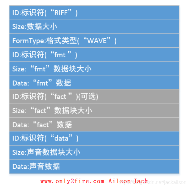WAV符合RIFF文件格式标准,可以看作是RIFF文件的一个具体实例。既然WAV符合RIFF规范,其基本的组成单元也是chunk。一个WAV文件通常有三个chunk以及一个可选chunk,其在文件中的排列方式依次是:RIFF chunk,Format chunk,Fact chunk(附加块,可选),Data chunk。示意图如下: