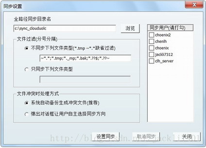 云管理员鼠标右击[同步],选择菜单[添加同步目录]。同步目录可指定任意路径,甚至整个盘符;文件过滤则可实现只同步指定的文件类型;冲突文件处理选项可根据实际情况选用,一般推荐第一种方式,当文件发生冲突时自动产生冲突文件,同时保留原文件(对于冲突文件的处理,将专门开辟一篇文章详述)。云管理员可以添加多个同步目录,每个同步目录可勾选不同的同步用户。点击[设置同步],一个同步目录创建完成了。
