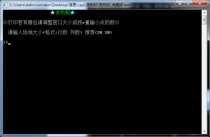 printf("⊙打印若有错位请调整窗口大小或按r重输小点的数⊙\n\n 请输入场地大小(格式:行数 列数) 推荐(20 20) \n\n>>");