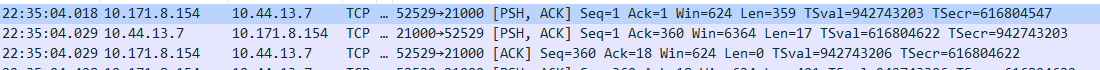 Transmission Control Protocol, Src Port: 21000, Dst Port:52529, Seq: 12936, ACK 183589 Len: 17 传输控制协议TCP的内容