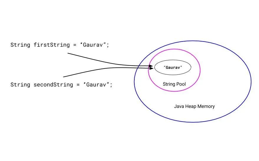 看到上面的代码,只有两个字符串对象将被创建。前两个变量将引用同一个字符串对象,其值为 "Gaurav"。JVM使用字符串池的概念,将重复的字符串对象只存储一份到字符串常量池。