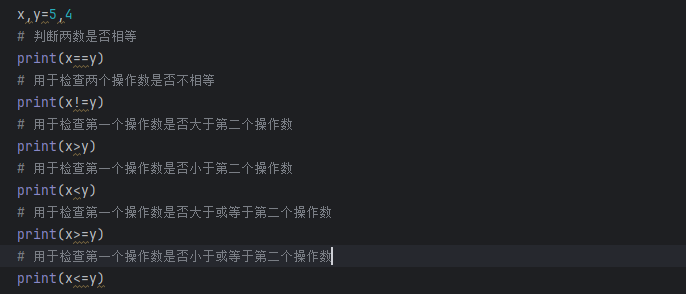 | 不等于运算符(!=) | 用于检查两个操作数是否不相等 | x!=y | True |