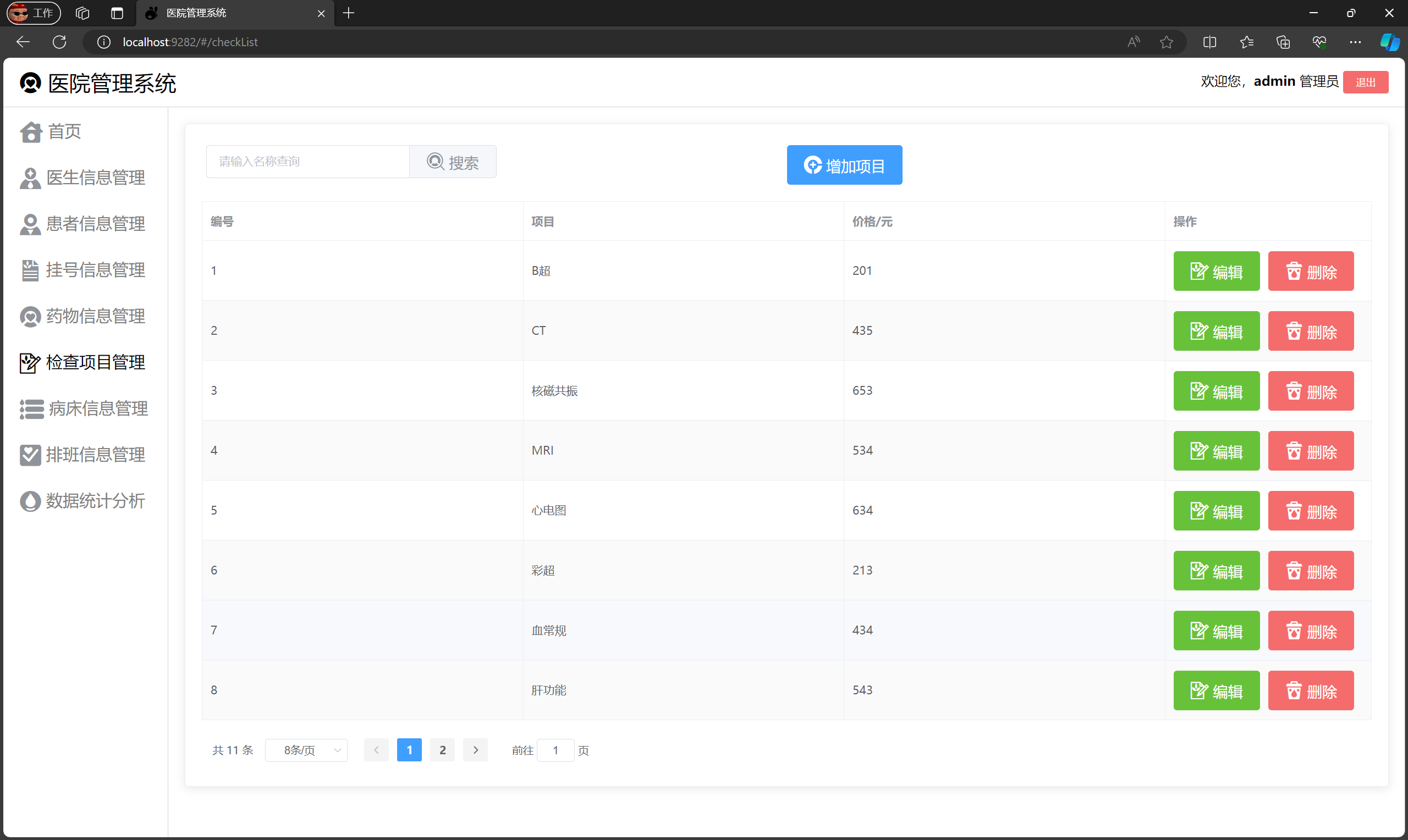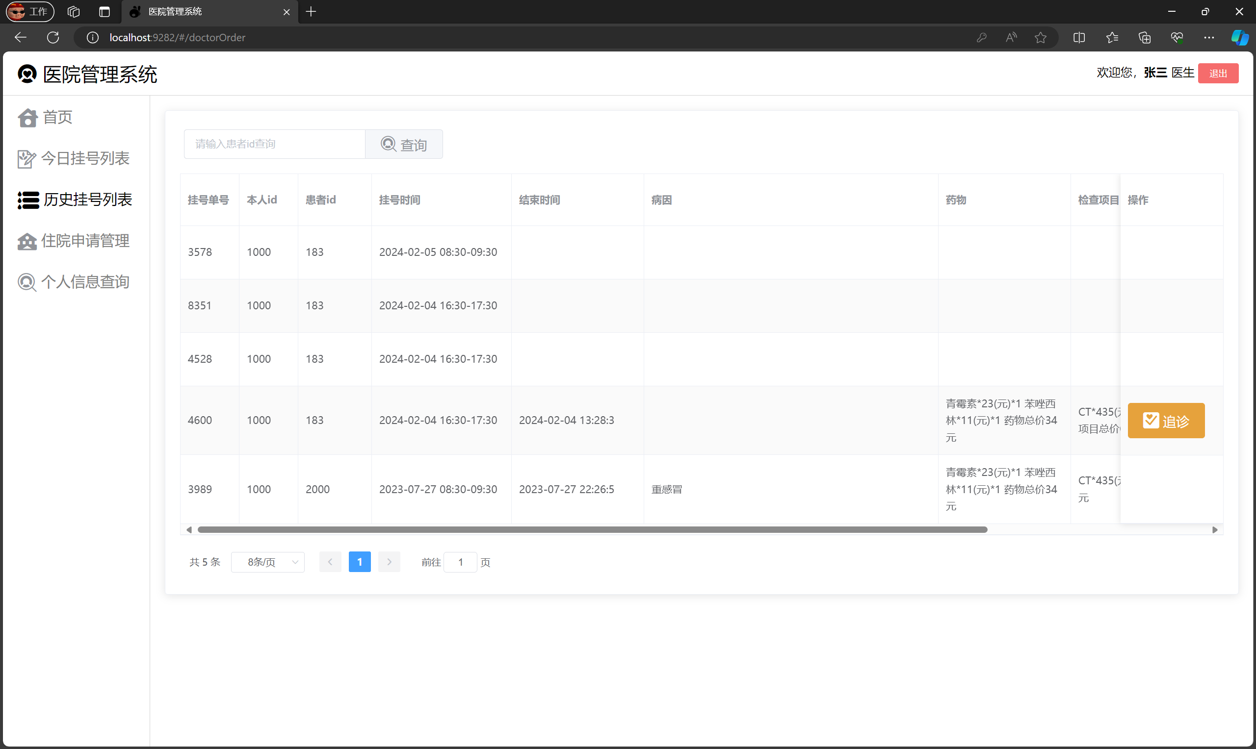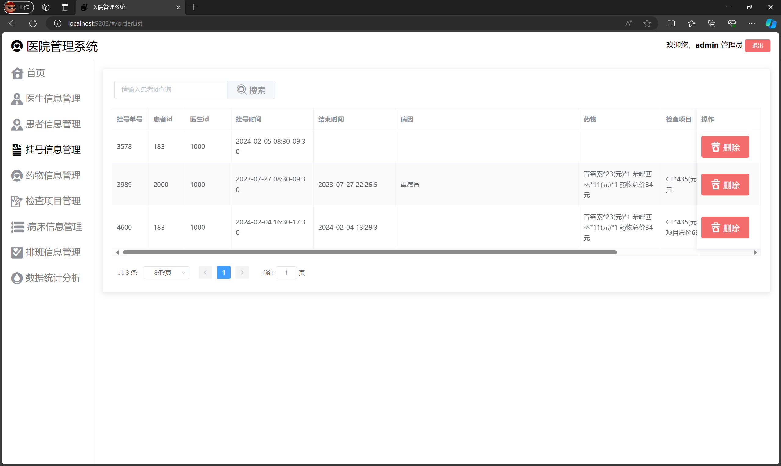 挂号管理:后台管理员可以查看到所有挂号的信息,以及检查项所开的药品与价格明细。