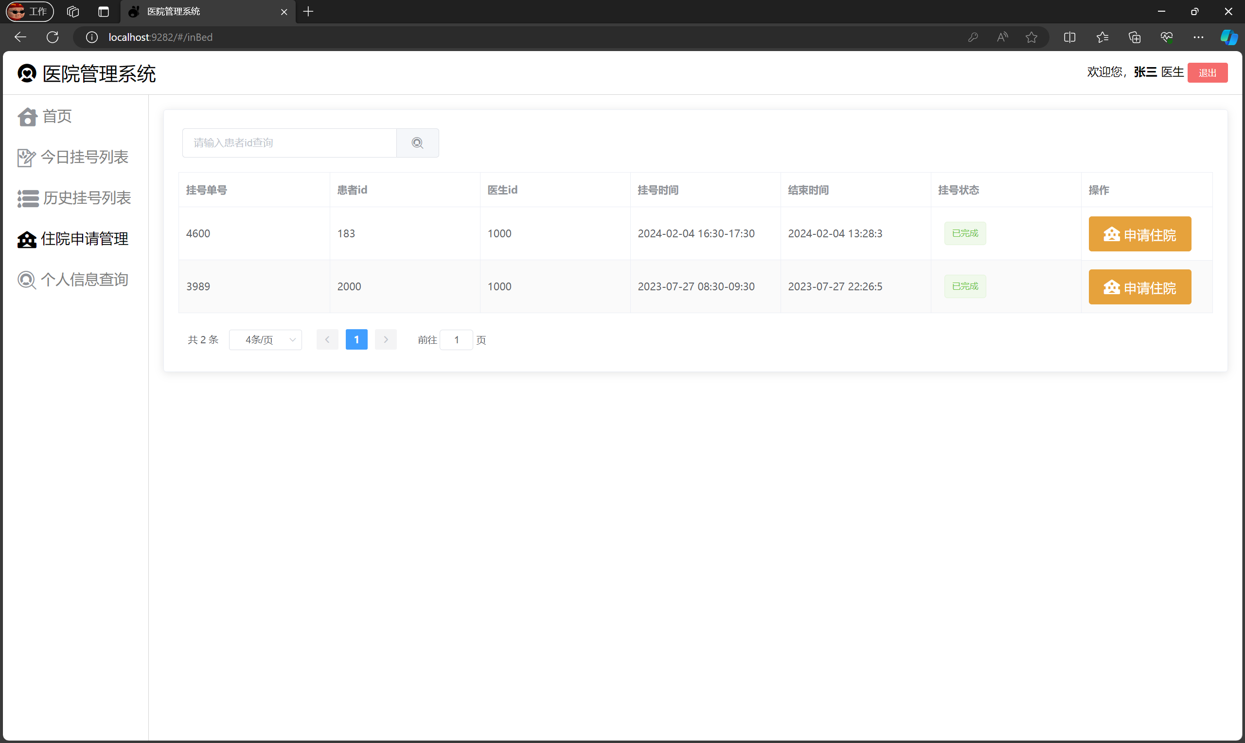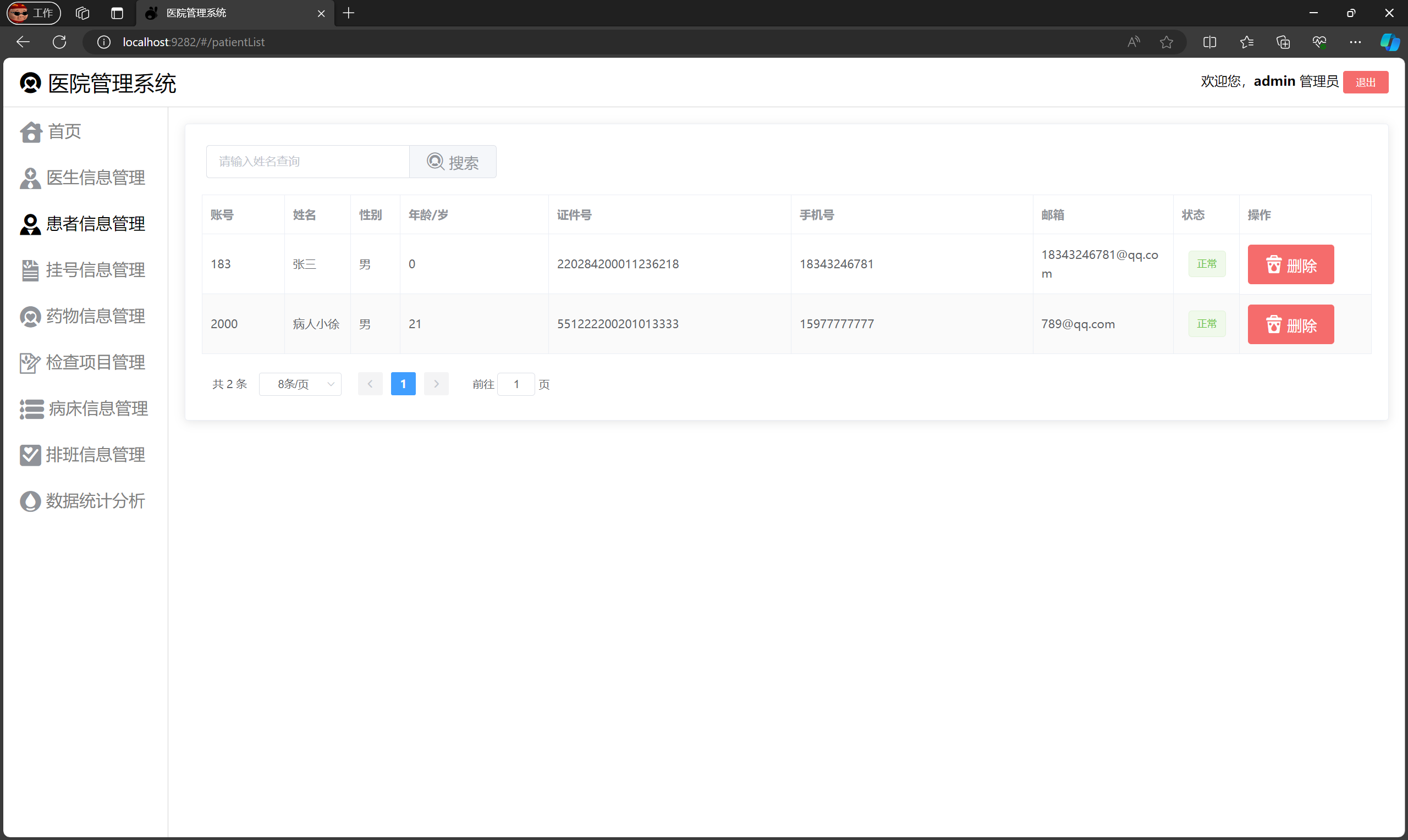 患者管理:可以分页模糊查询患者信息。支持删除功能。