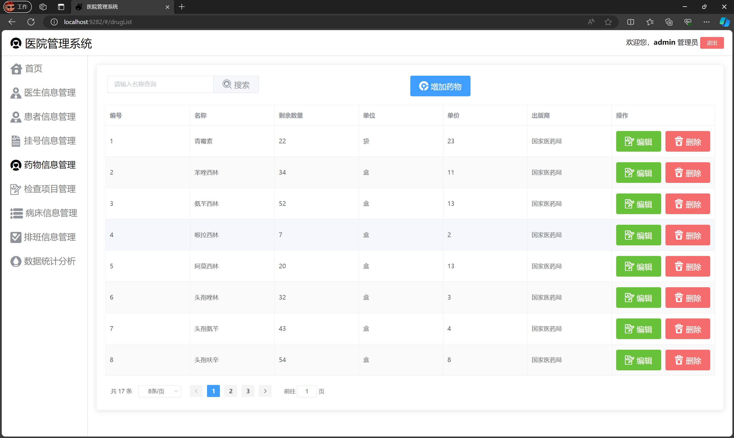 药物管理:管理药物信息支持新增、编辑、删除功能。同时来维护药物价格。